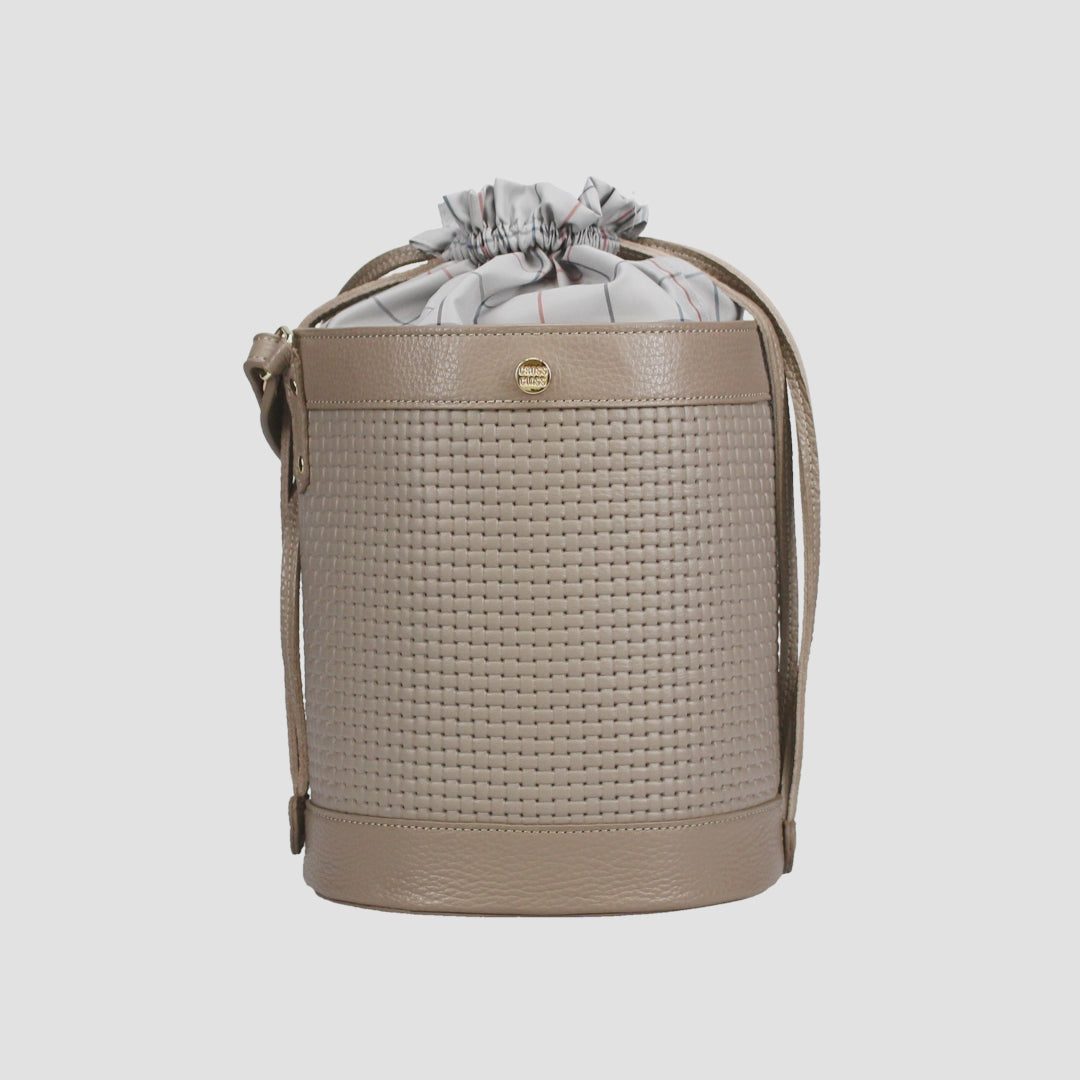 異なる2素材を組み合わせたバケット型バッグ。