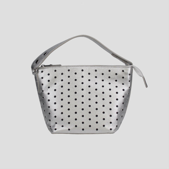 イタリアのシャイニーレザーに、均等に施された水玉のカットワーク加工が上品で正統派な印象を与えるコンパクトバッグです。