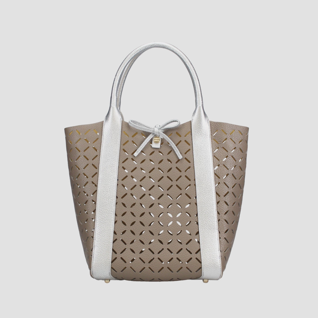ハンドルにはシャイニーなメタリックレザーをポイントとして使用し、軽量で大容量のトートバッグに仕上げています。