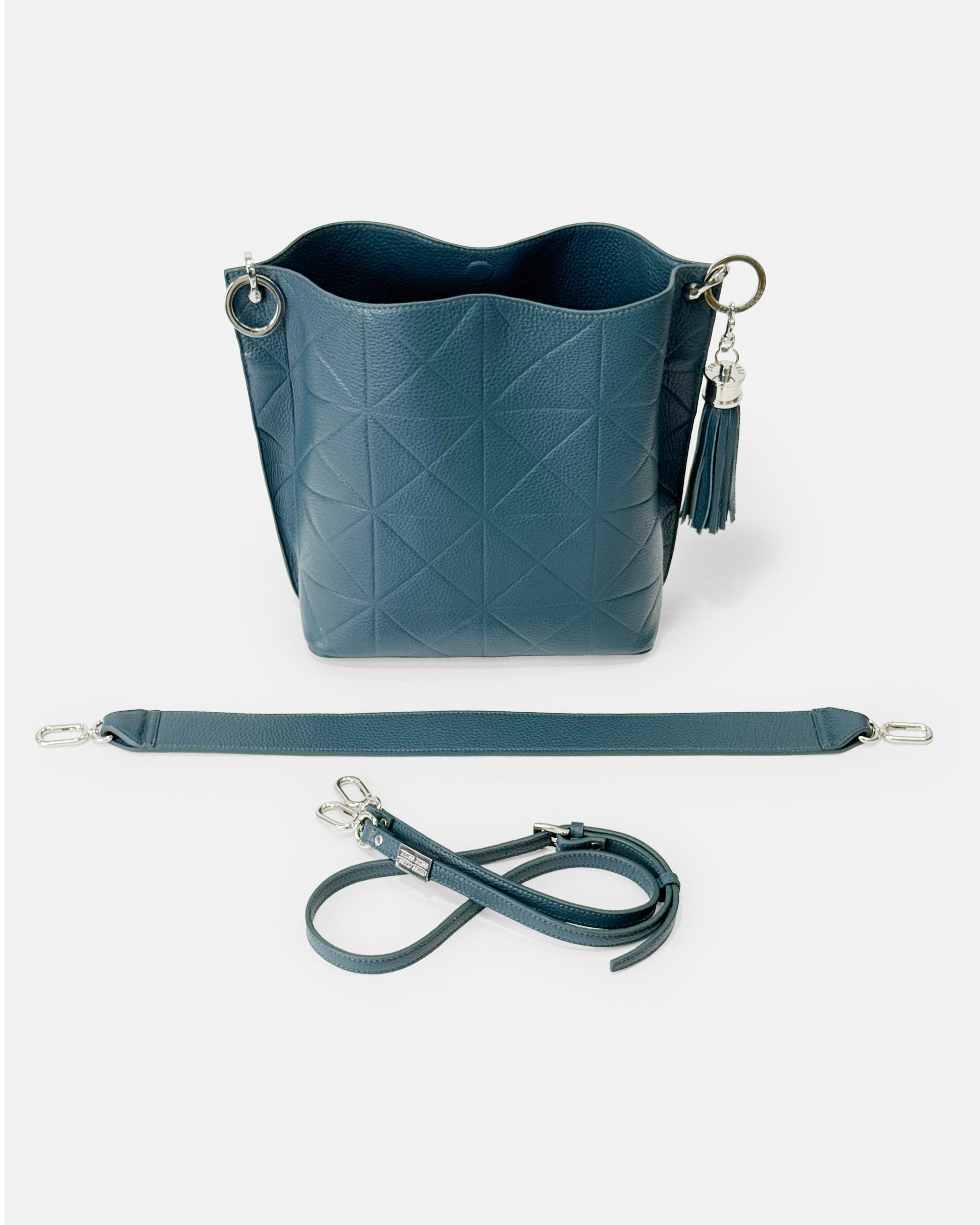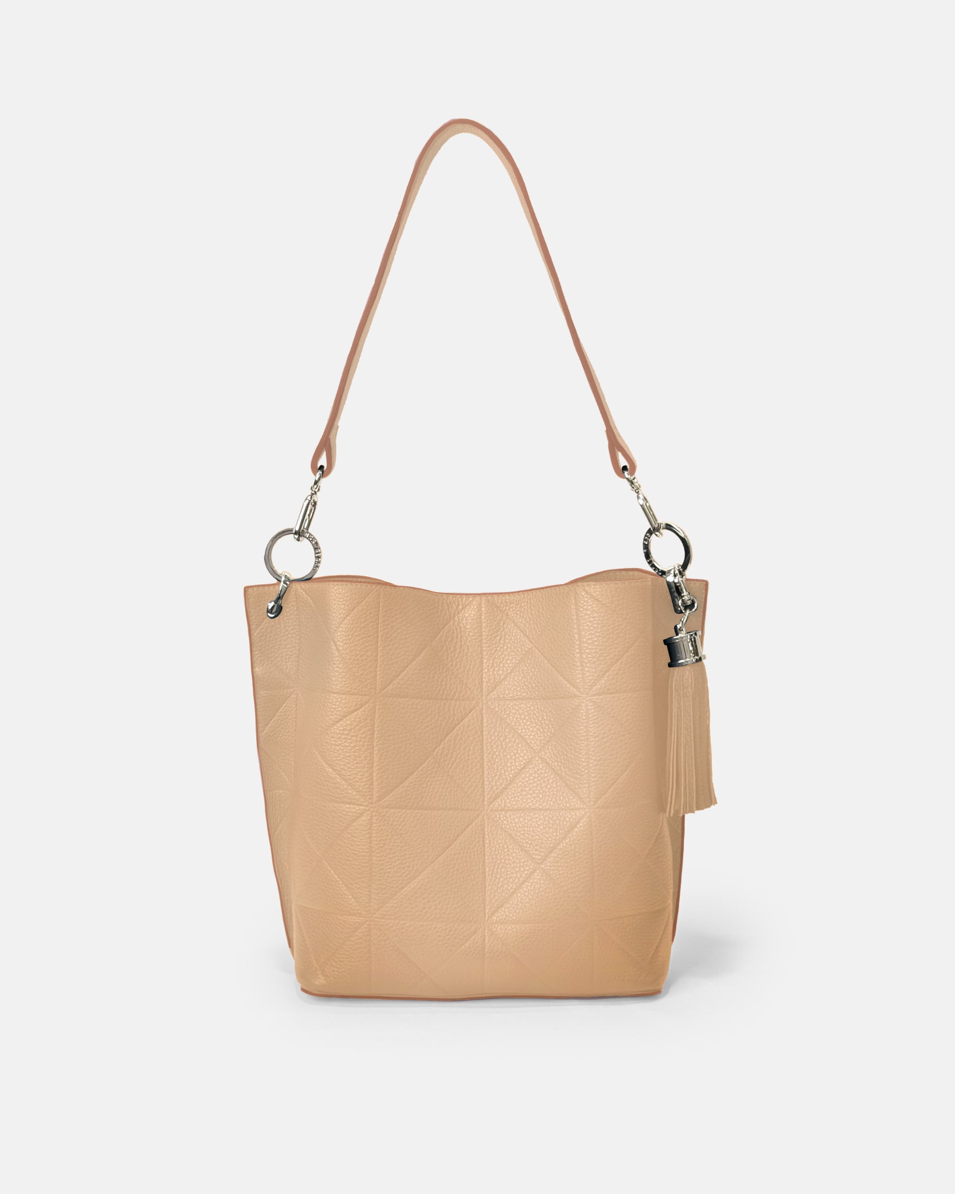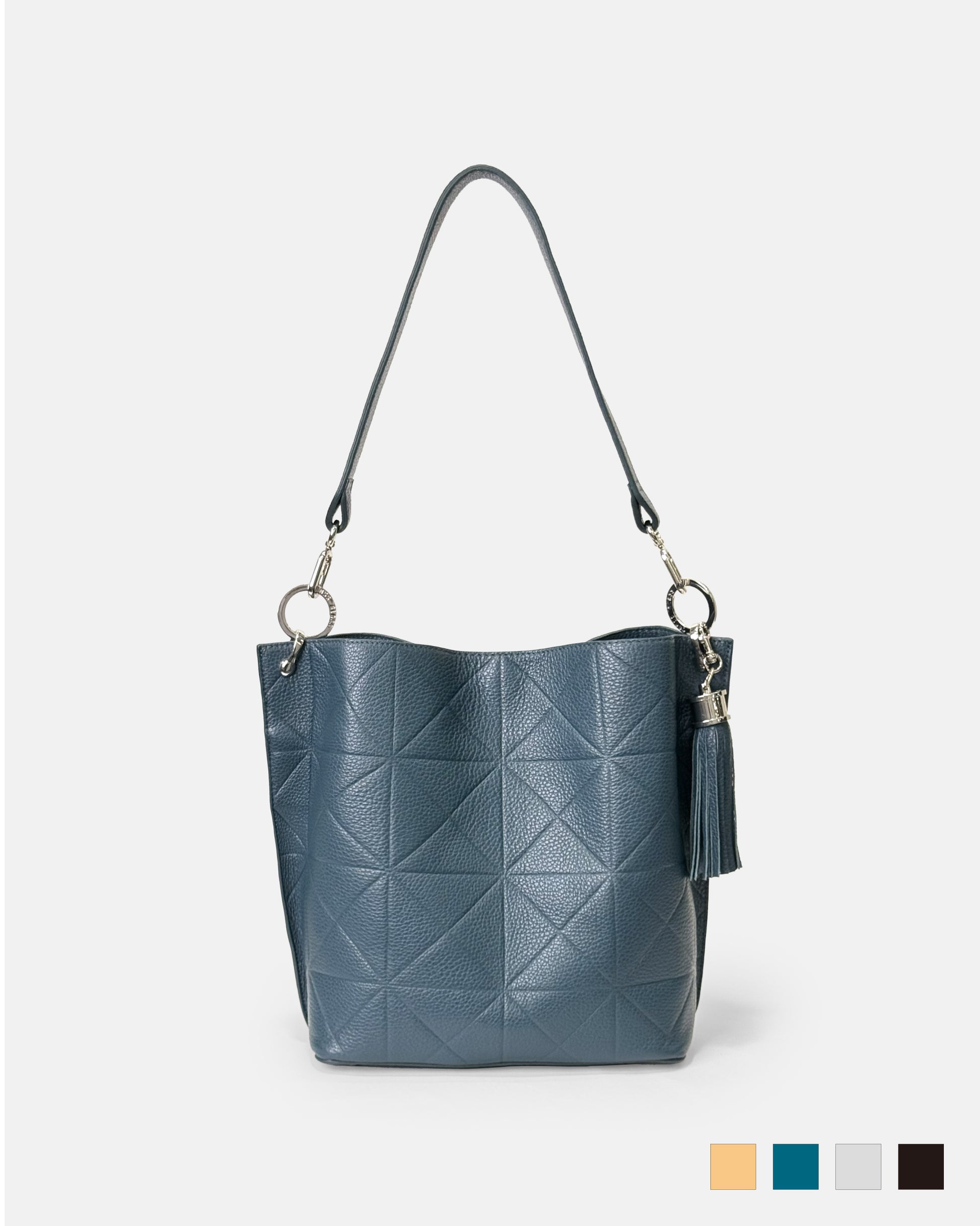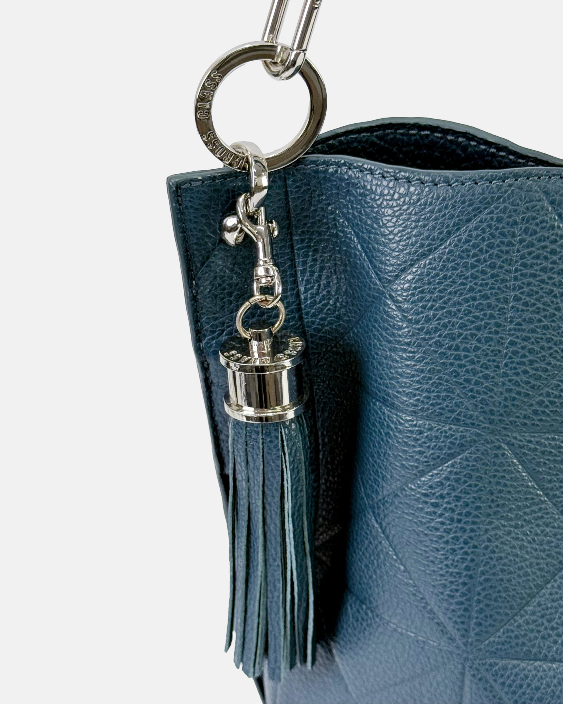 ショルダーベルトを繋ぐリングにはブランドロゴを刻印し、タッセルレザーもオリジナル仕様で、インポートバッグのような高級感を演出。